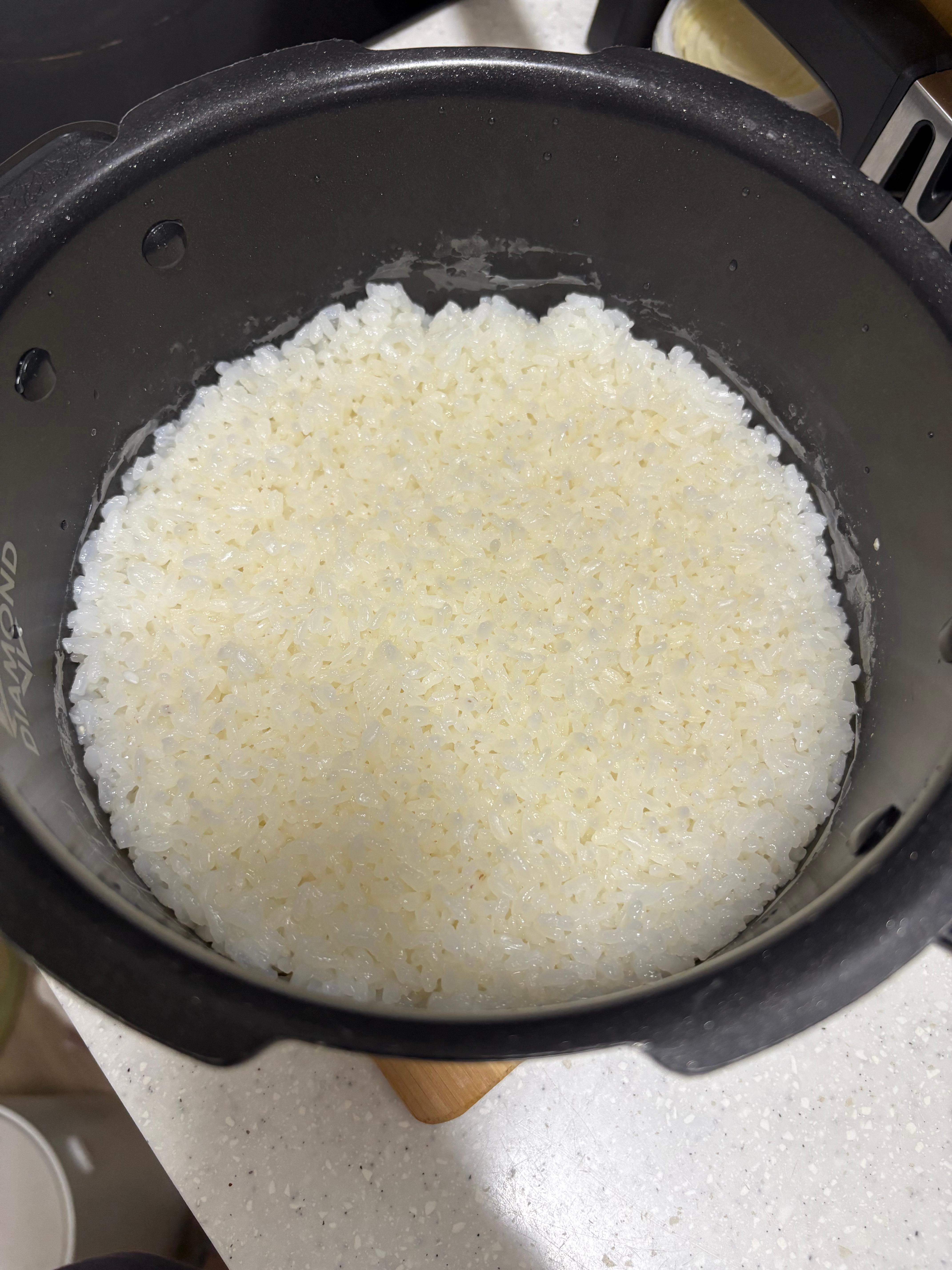 쌀과 물을 1:1 비율로 한 밥짓기의 결과물입니다.